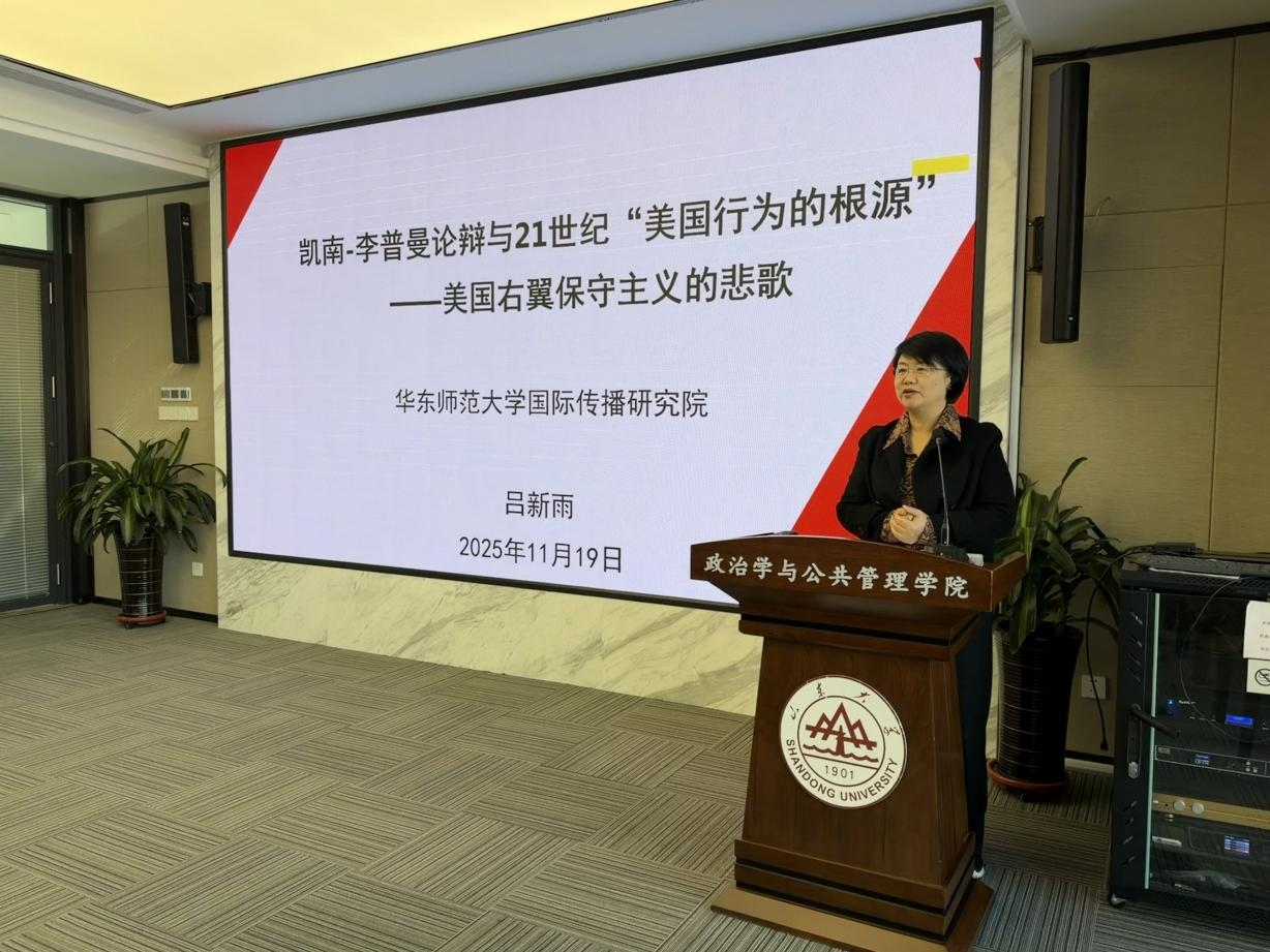 11月19日下午,由政治学与公共管理学院、山东大学上海合作组织研究院、山东大学公共安全研究院、中国-上海合作组织经贸学院联合主办的“合作与发展”系列讲座第三十三期在青岛校区举办。本期讲座主题为“凯南–李普曼论辩与21世纪‘美国行为的根源’”,由华东师范大学国际传播研究院院长、国家级人才称号获得者吕新雨主讲。讲座由山东大学政治学与公共管理学院特聘教授、上海合作组织研究院执行院长盛力主持,政管学院师生参加本次学术交流。讲座开始前,山东大学政治学与公共管理学院院长马奔为吕新雨颁发山东大学上海合作组织研究院高级研究员聘书。